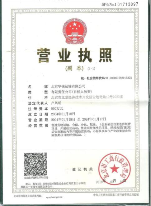 北京華銘運輸有限公司,于2004年經北京市工商局批準注冊的有限責任公司(自然人獨資),注冊資金4560萬,總部位于北京,服務范圍遍及中國大陸地區,核心業務包括物流運輸,倉儲,包裝及供應鏈解決方案,為各行業、各類型商品、輔助品、半成品及原材料提供高品質的專業物流服務。